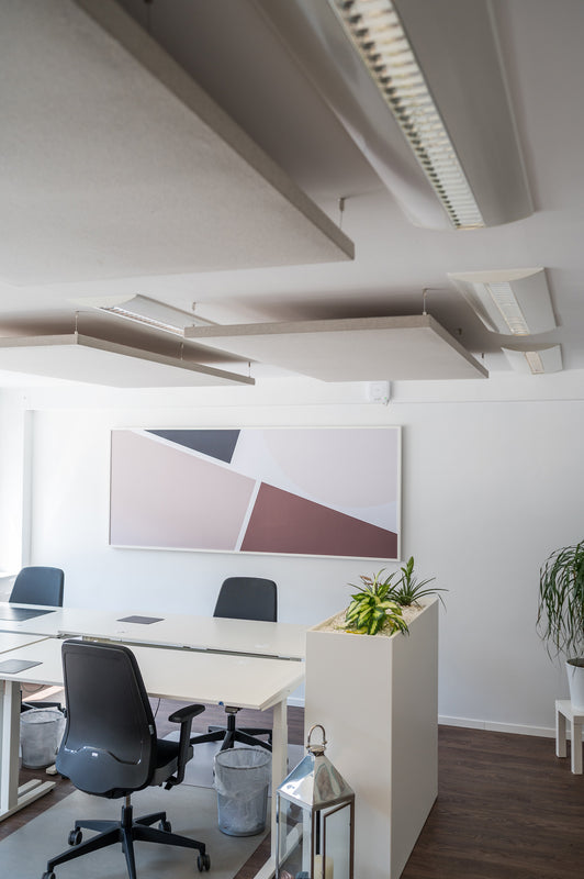 Achten Sie bei der Auswahl Ihrer Akustikbilder und Deckenabsorber also auf den Schallabsorptionsgrad. Je höher, desto besser absorbiert das Produkt Ihren Lärm und Nachhall im Raum.