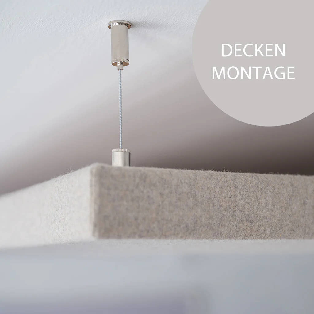 Unsere Deckensegel liefern wir mit hochwertigen Drahtseil-Abhängungen, die bereits vormontiert sind. Auch hier empfehlen wir Dübel und Schrauben in der Größe 8 oder 10.