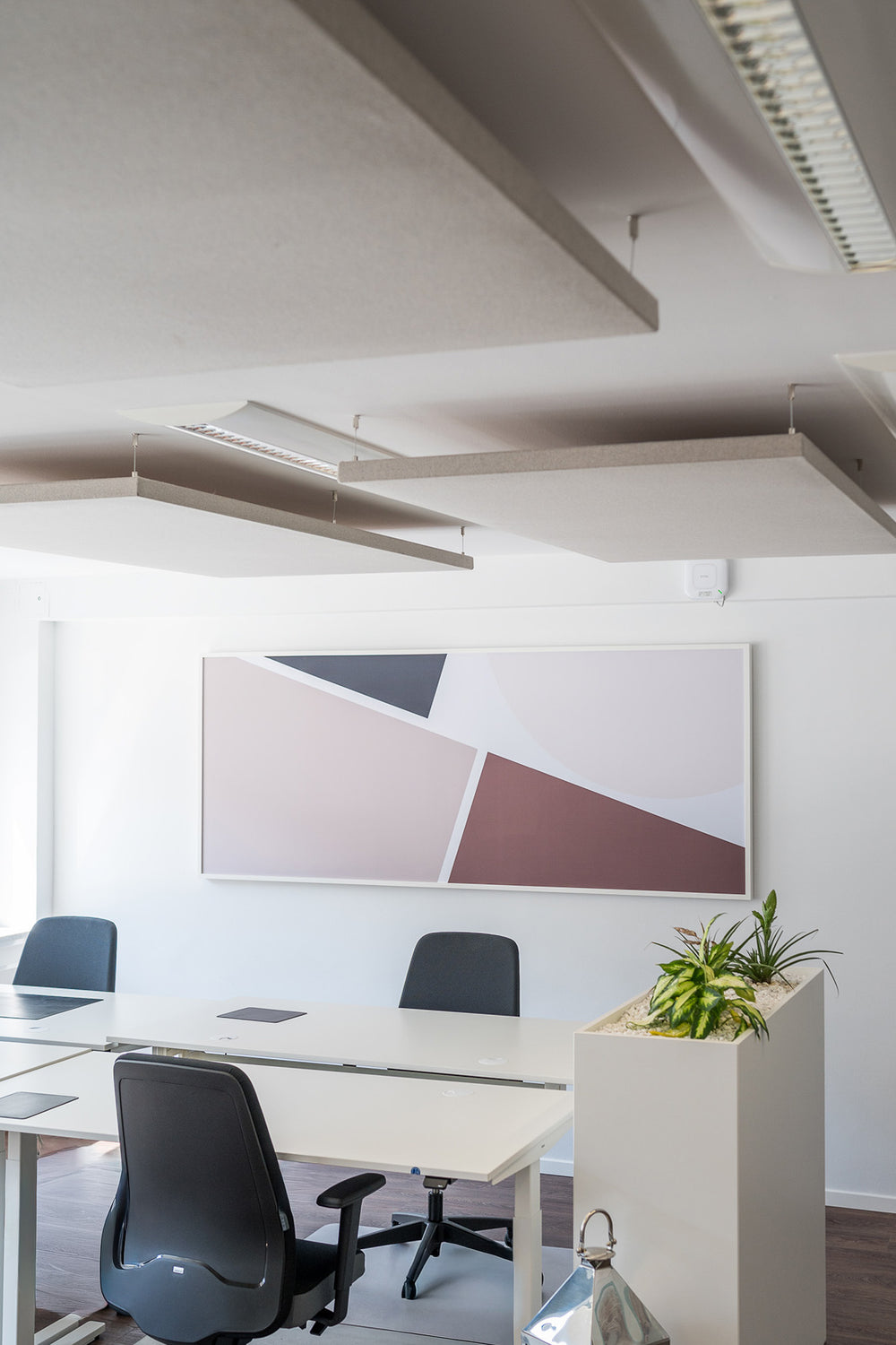Zur Verbesserung der Raumakustik wurden Deckenabsorber und Wandabsorber kombiniert eingesetzt. Diese Maßnahme reduzierte den Nachhall deutlich und sorgte für eine gleichmäßigere Schallverteilung im gesamten Raum, ohne das bestehende Raumkonzept zu verändern.