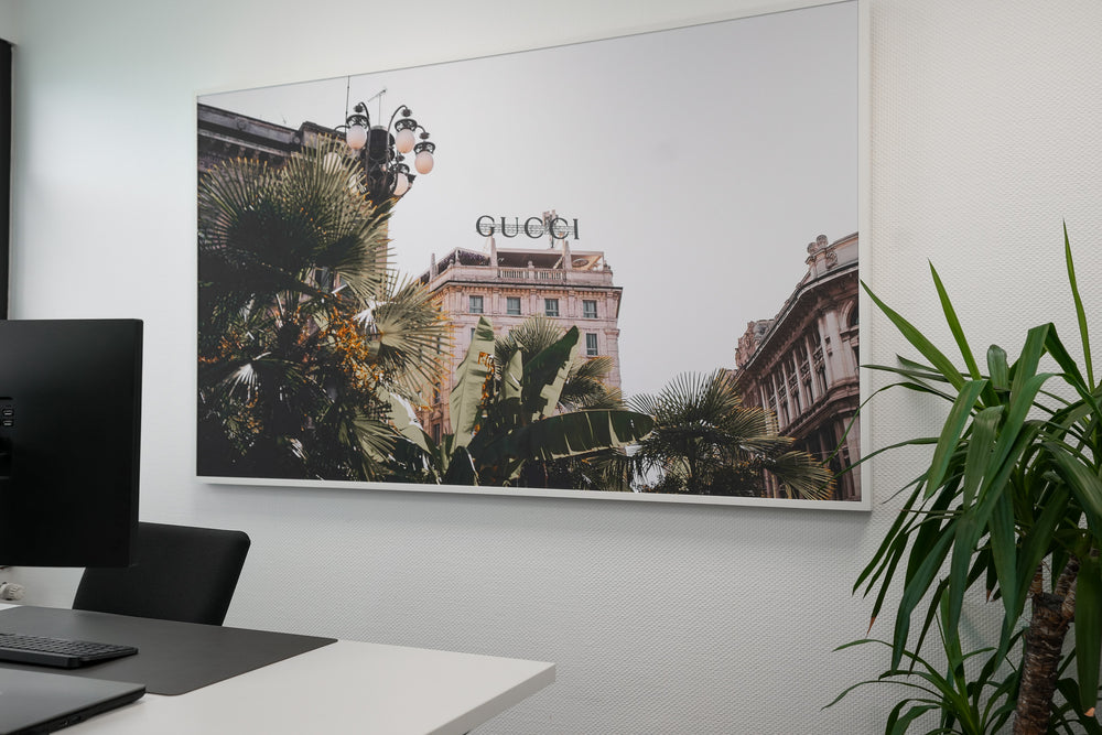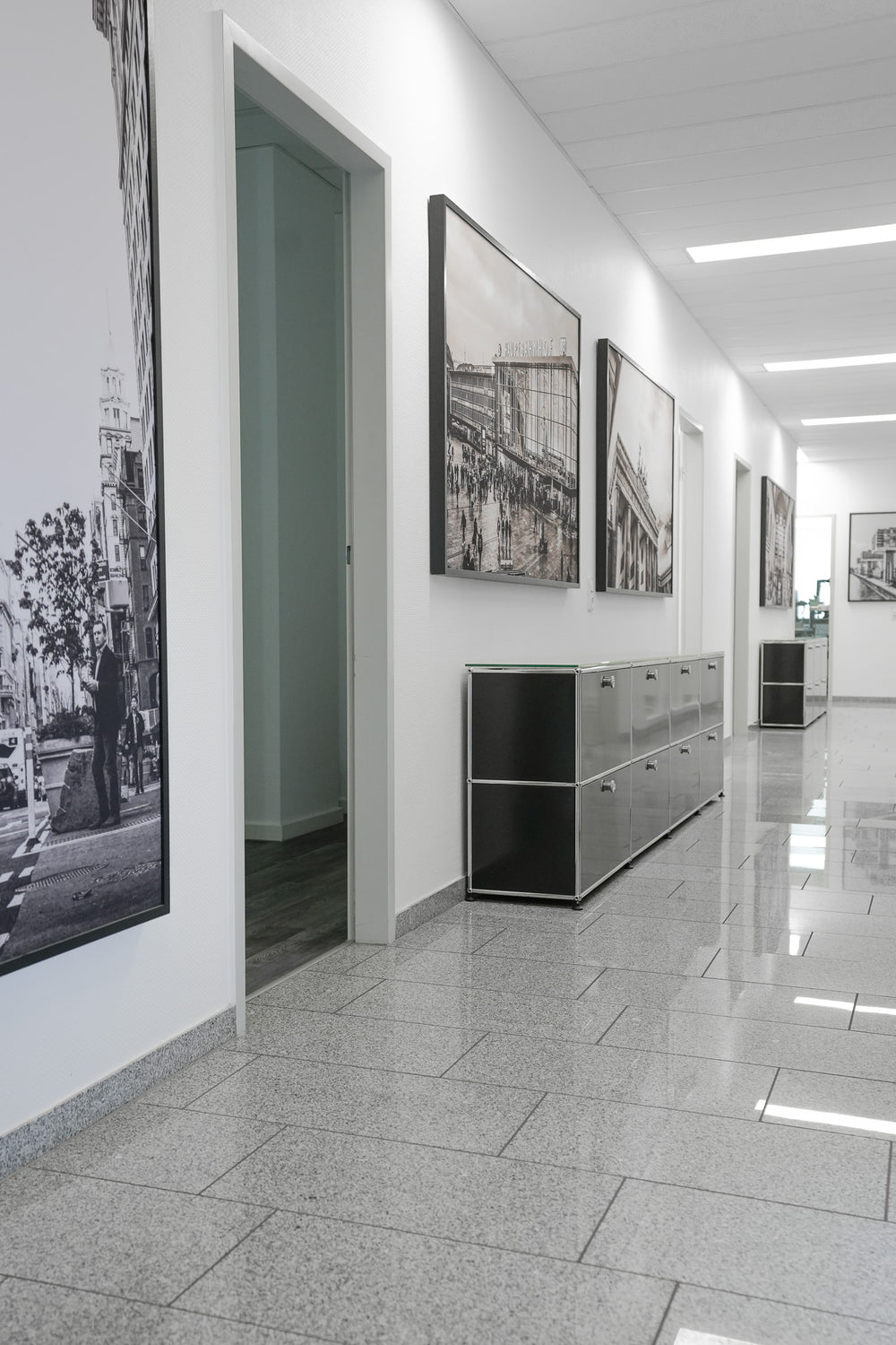 Die Büroräume von Löhr & Partner wiesen durch den polierten Granitboden und glatte Wandflächen eine erhöhte Nachhallzeit auf. Besonders im Flurbereich führten die harten Oberflächen zu starken Schallreflexionen und einer spürbaren Geräuschbelastung. Der großzügig verglaste Konferenzraum verstärkte diesen Effekt zusätzlich und beeinträchtigte die Sprachverständlichkeit.