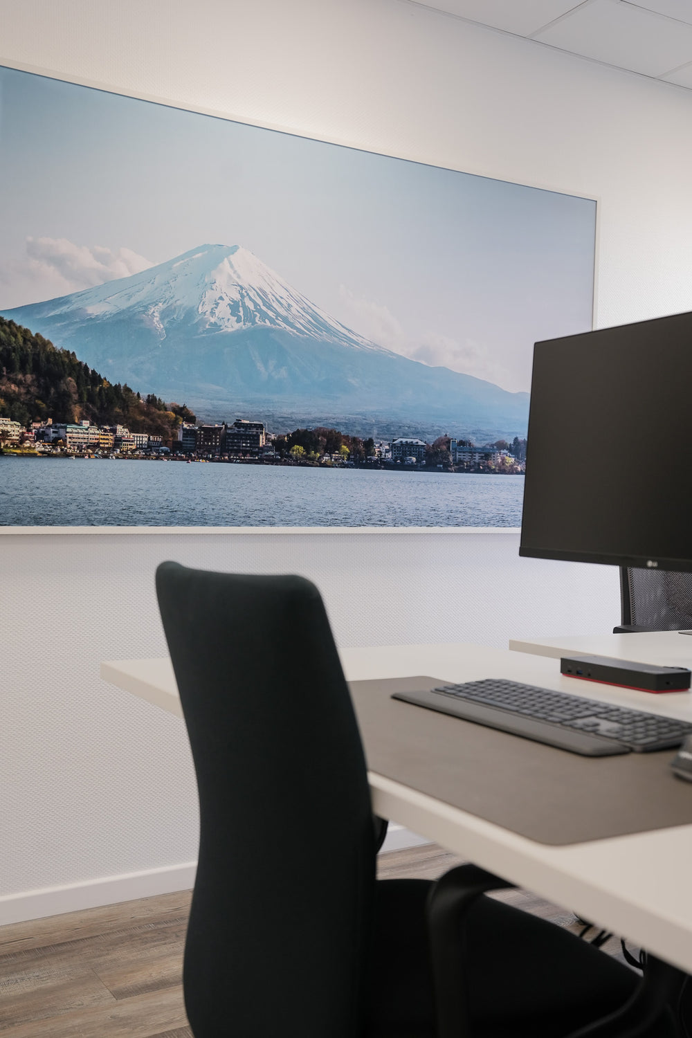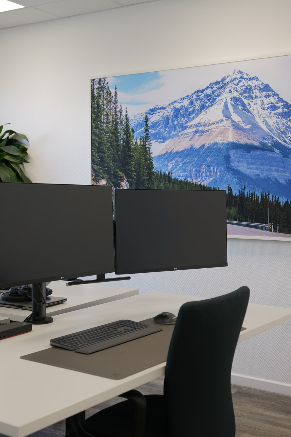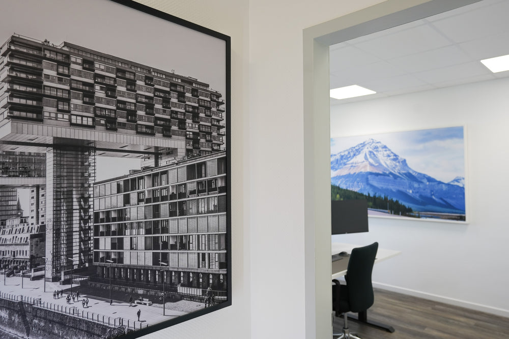 Zur akustischen Optimierung entwickelte Akustikwerke ein objektspezifisches Konzept mit individuell abgestimmten Wandabsorbern. Neben der messbaren Reduktion der Nachhallzeiten entstand ein gestalterisches Detail: Jeder Mitarbeitende konnte das Motiv seines Wandabsorbers selbst wählen – so erhielt jedes Büro eine individuelle, akustisch wirksame Gestaltung.