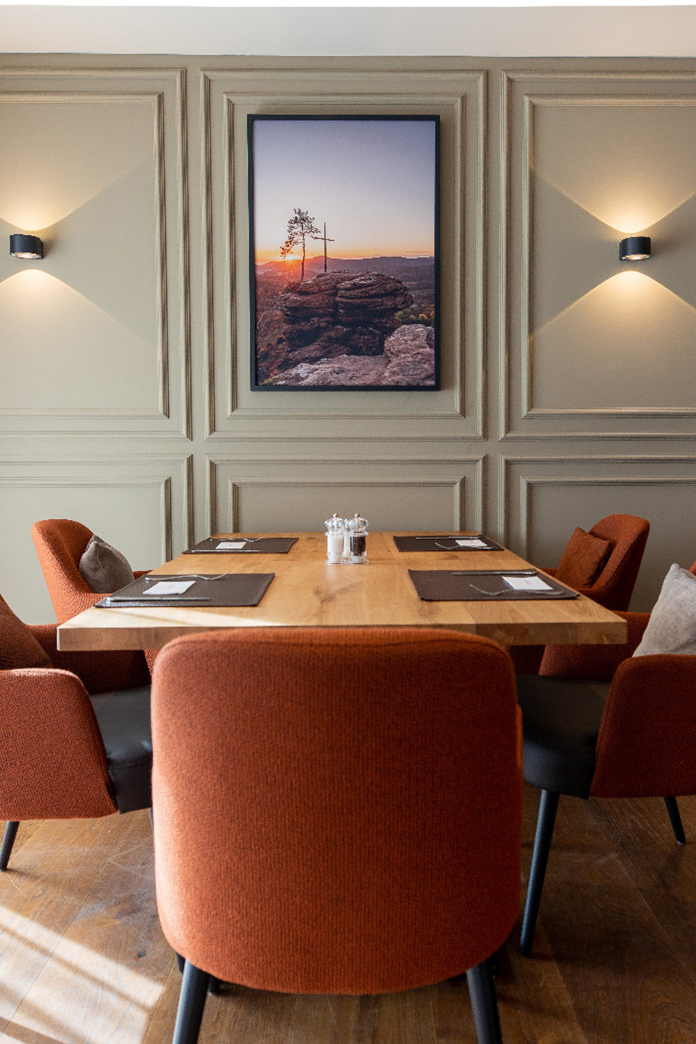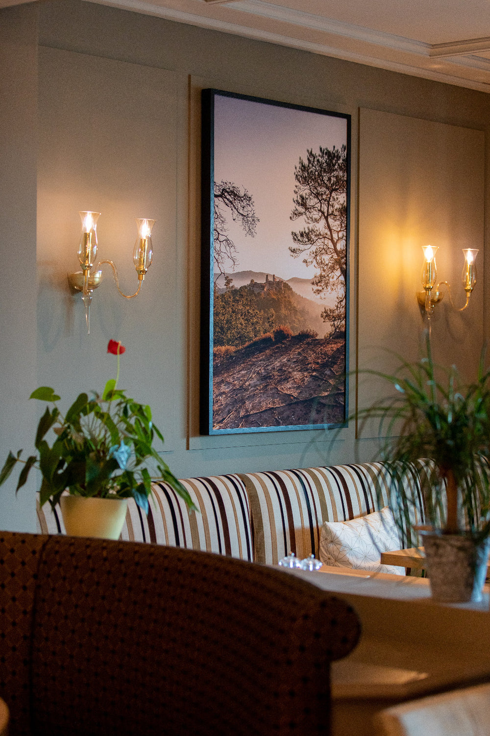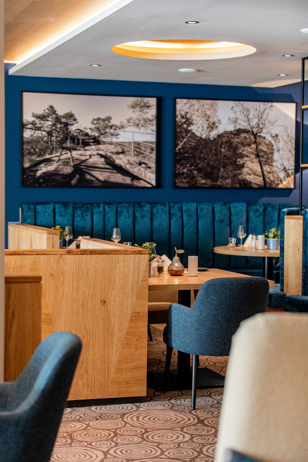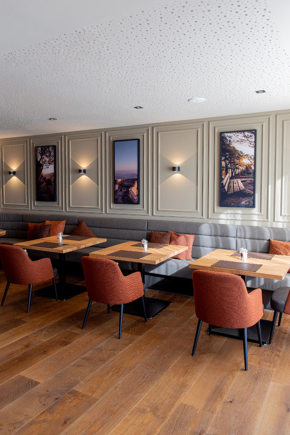 Um die Raumakustik im Resort zu optimieren, wurden maßgefertigte Wandabsorber mit Naturmotiven aus der Pfalz eingesetzt. Die Kombination aus akustischer Wirksamkeit und regionaler Bildsprache schafft eine harmonische Verbindung von Funktion und Design. Gefertigt aus massivem Eichenholz überzeugen die Elemente durch ihre hochwertige Anmutung und langlebige Qualität und tragen zu einer Atmosphäre bei, in der Ruhe und Wohlbefinden selbstverständlich sind.
