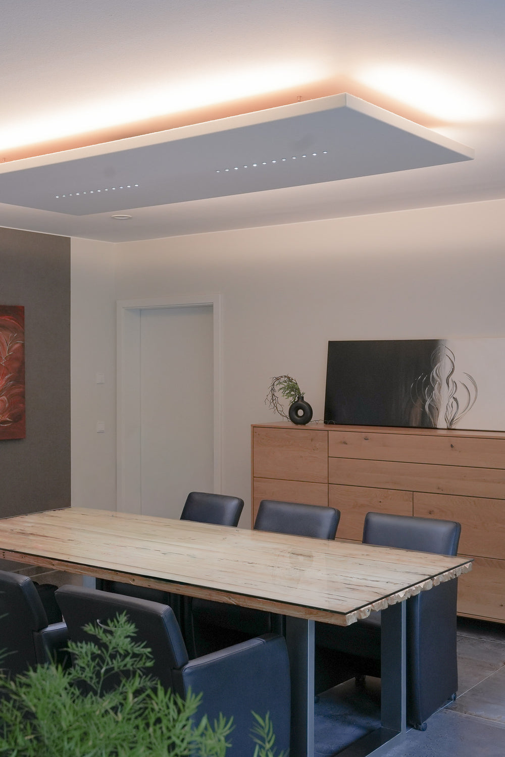 Zum Einsatz kamen Akustiksegel der Serie SOMARA, die höchste Schallabsorptionsklasse A mit einem integrierten, variablen Beleuchtungssystem verbinden. Diese hochwertigen Deckenabsorber wurden exakt auf das bestehende Interieur abgestimmt und fügen sich nahtlos in die architektonische Gestaltung ein.