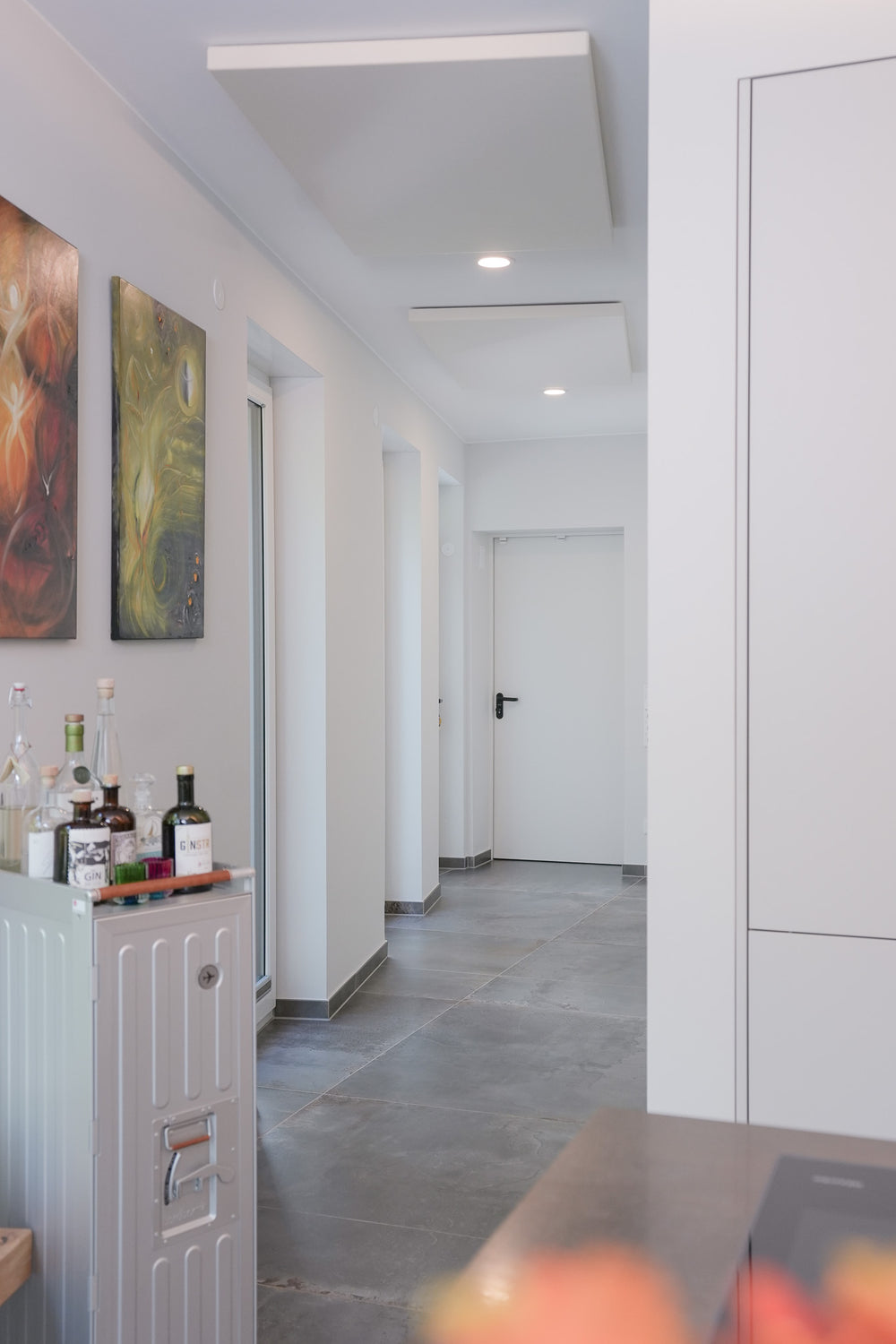 Das moderne Wohnhaus beeindruckt durch seine offene Architektur, klare Linien und den Einsatz hochwertiger Materialien. Große Fensterflächen, glatte Oberflächen und großzügige Raumhöhen verleihen dem Haus eine elegante Leichtigkeit, stellen akustisch jedoch eine besondere Herausforderung dar.