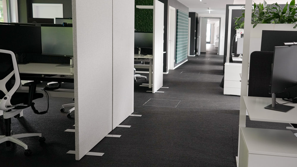 In offenen Gruppenbüros wird, zusätzlich zur Nachhallreduzierung, Zonierung entscheidend. Freistehende Absorberelemente oder Raumteiler in 1,60–1,80 m Höhe schaffen akustisch abgeschirmte Arbeitsbereiche – ohne die Offenheit des Raums komplett aufzugeben.